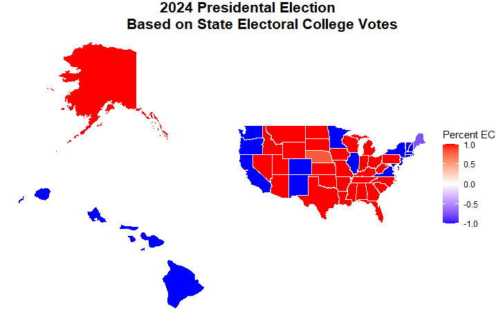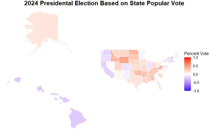 This graph shows a complete “victory” based on getting to the 270 Electoral College Vote benchmark. No matter your feelings about the Electoral College system, this is the way the United States currently does presidential elections, so we use it. Also, Alaska and Hawaii look gigantic. This was how I figured it out without doing any external editing of the figure. The color saturation is what I want you to focus on.